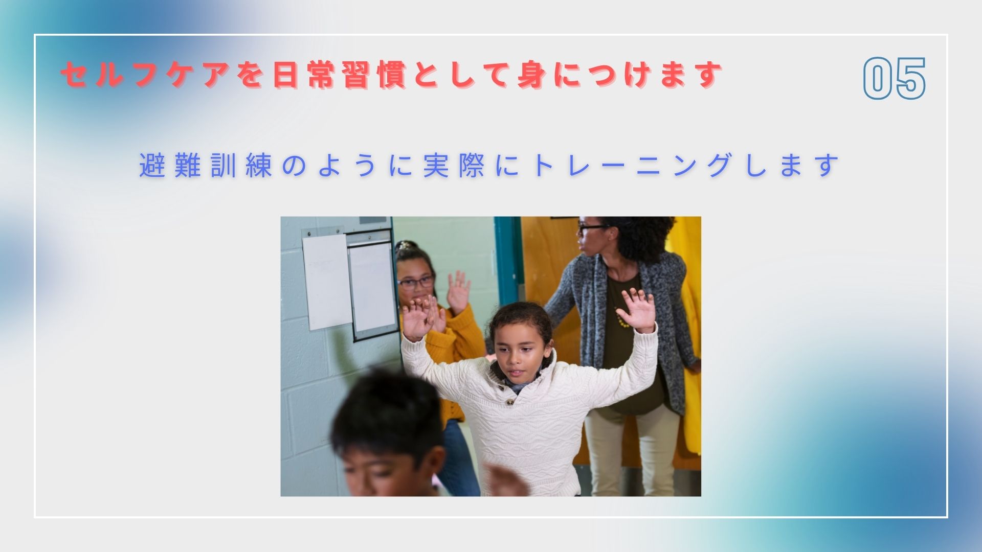 しかし、心配は不要です。必要なスキルは本格的な避難訓練ほど複雑ではありません。次のページで紹介する4つのスキルを学び、習慣化するだけで、どんな状況でも困難を乗り越えることができます。これらのスキルを習得することが、自分自身を大切にする「セルフケア」に繋がります。